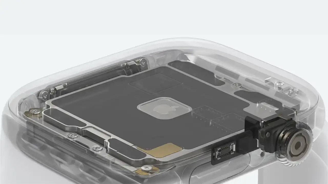 Digital Crown, buton lateral, difuzor, microfon, senzor cardiac, accelerometru, conectivitate Bluetooth și Wi-Fi.